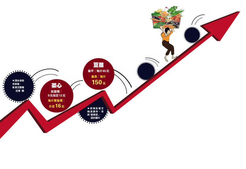 一名菜檔檔主溫小姐表示,由於跨境貨車司機染疫,蔬菜來貨量減少,來貨價也相應提高最少兩成,比如來自河南省的菜心,零售價由以往24元一斤,加至近30元一斤。不過,最教菜檔檔主頭痛的不是菜價上升,而是無菜可賣。菜販何小姐表示,已改賣本地菜,但葱的主要產地是內地:「完全無得入,以往啲人嚟買嘢都會送葱,當日送唔到。」