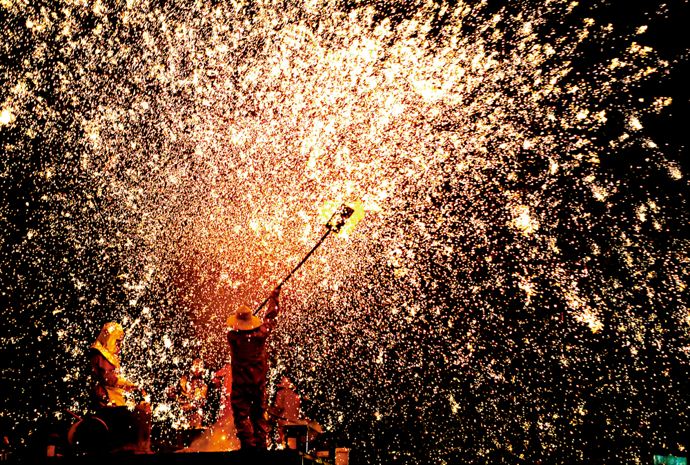 在河南洛陽,民俗藝人為市民、遊客表演「打鐵花」,喜迎元宵佳節。\新華社