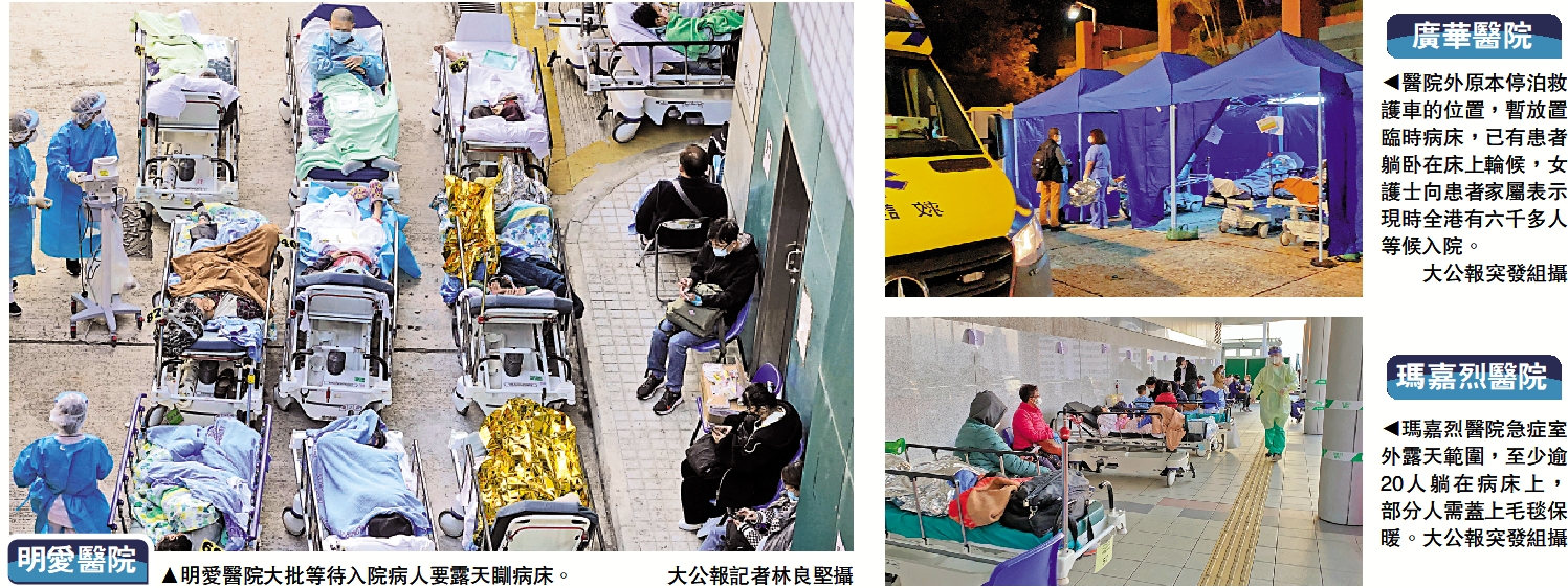 在廣華醫院,昨傍晚六時半急症室等候時間超過八小時,醫院內病床已爆棚,病床已擺出停車處。記者現場所見,急症室外臨時搭建的藍色帳篷內,安置有10多名病人連病床,大部分為長者,其中一名老婦躺卧在帳篷內,不停發抖。其間,老婦家屬緊張地向一名女護士查問輪候情況,女護士無奈地回答:「沒辦法!急症室爆棚,答不到你還要等多久,現在全港醫院、醫管局有六千多人等候入院!」瑪嘉烈醫院方面,急症室輪候亦超過三小時,在行人路處以膠帶劃出病人等候區。據醫護人員透露,範圍內為有發燒等病徵的病人,惟未知病人有否染疫。現場所見,昨午該臨時區域連同病人家屬約有15人,其中約5名為兒童,內裏有兒童需除下口罩飲食,增加病菌或病毒傳播風險。