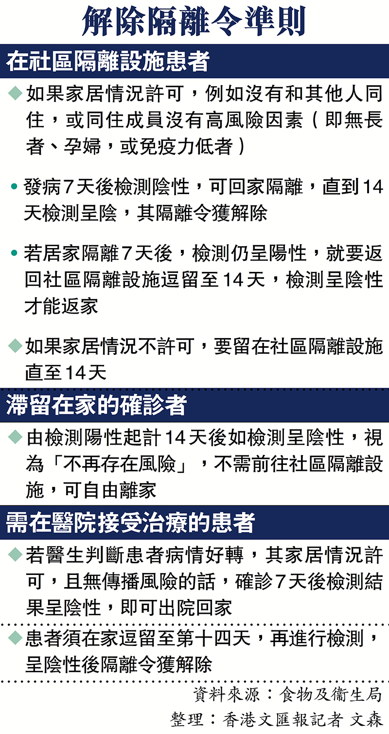 徐德義指出,如確診者的家居情況許可,包括沒有其他人同住,或同住成員不是長者、孕婦及免疫力低等高風險者。患者只要於檢測陽性當日起計7天後,再接受檢測呈陰性,即可由社區隔離設施返家繼續隔離。患者居家隔離期間,須在家逗留多14天再檢測,獲得陰性結果後,隔離令便獲解除。不過,若居家隔離7天後,檢測仍呈陽性,就要返回社區隔離設施逗留至14天,並獲得陰性結果才能返家。