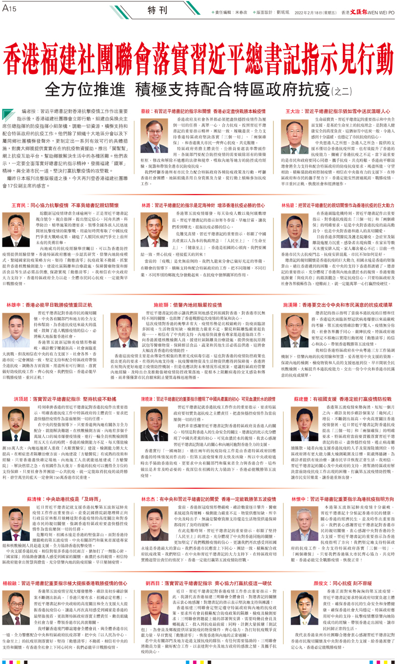 本港第五波新冠肺炎疫情十分嚴峻,習近平總書記十分惦記香港市民的健康,關心香港的經濟民生,並及時作出重要指示。我們衷心感謝習近平總書記對香港市民的親切關懷,衷心感謝中央對香港的全力支援。習近平總書記的重要指示為香港抗疫指明了方向!我們堅定地支持特區政府的抗疫工作,全力支持特區政府落實「三個一切」,「兩個確保」。只要我們香港廣大市民齊心協力,共克時艱,香港必能完全戰勝疫情,恢復正常!
