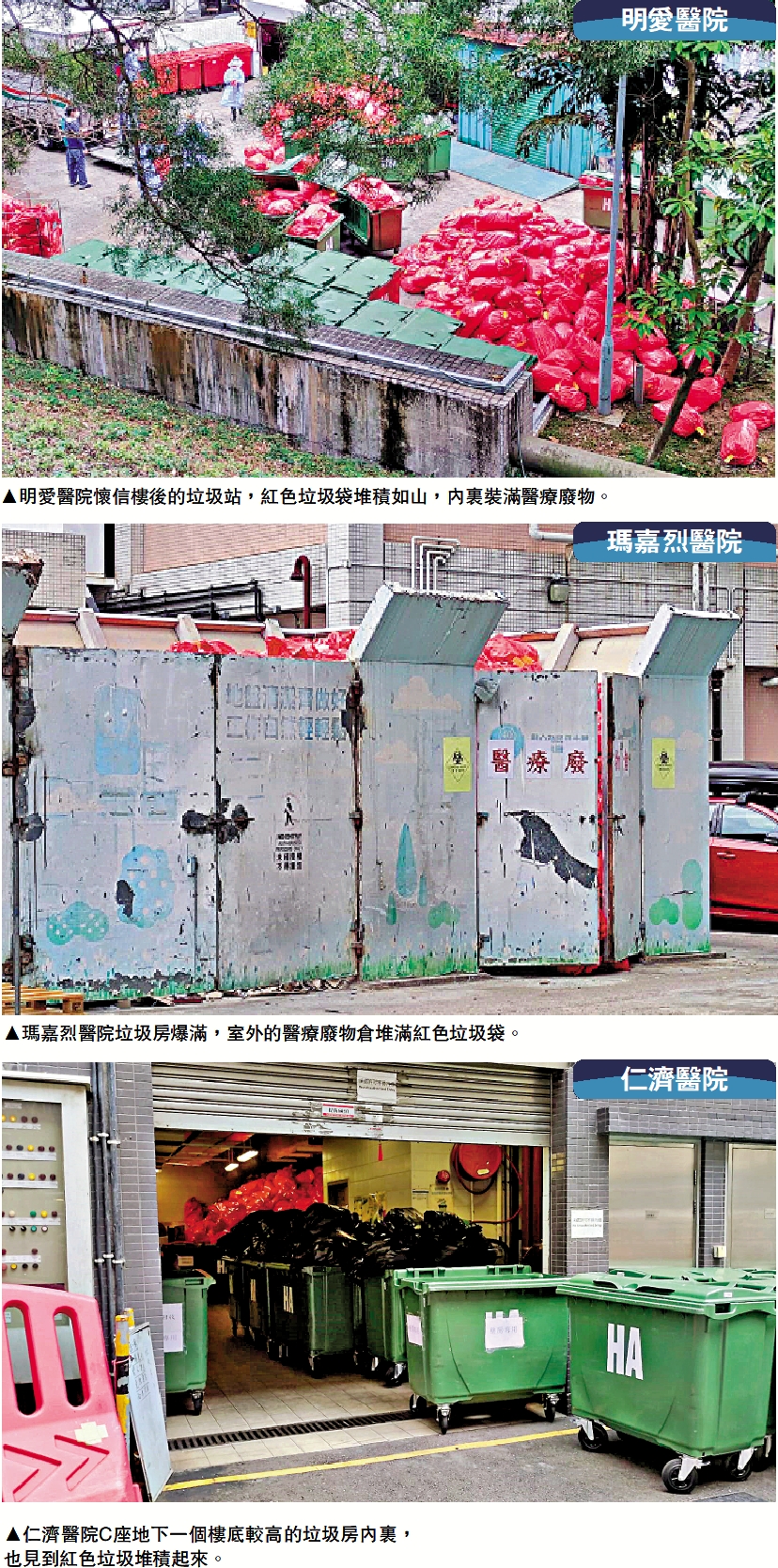 記者再到瑪嘉烈醫院,同樣見到紅色垃圾山,垃圾袋堆滿H座對開一個約200呎的醫療廢物倉,該範圍以鐵板圍起,但垃圾堆起已高過倉庫的圍封鐵板頂端,甚至擠得鐵板門都不能合上。該院E座地下對開的垃圾收集點同樣有垃圾山,垃圾站更被塞爆,大門落半閘,紅袋連同一般垃圾的黑色膠袋放到門外約20至30個的大型垃圾箱。至於仁濟醫院C座地下一個樓底較高的垃圾房內,也出現紅袋垃圾山。