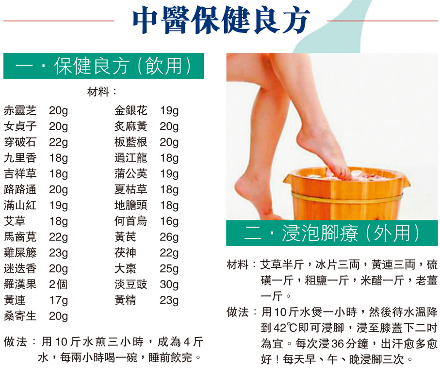 做法︰用10斤水煲一小時,然後待水溫降到42℃即可浸腳,浸至膝蓋下二吋為宜。每次浸36分鐘,出汗愈多愈好!每天早、午、晚浸腳三次。