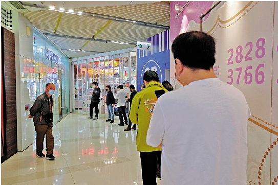 有得剪髮喇!髮型屋昨日解禁重開。北角一間連鎖快剪店等候區全部坐滿,店外更有數名客人分散站在不同位置等候,三名理髮師密密手剪。記者先後在下午3時及傍晚6時到場觀察,取籌編號從512變為551,即是3小時內服務了40位客人。新蒲崗另一速剪店外更出現人龍(見圖),排隊者清一色男士,人人都自覺隔開些少排。