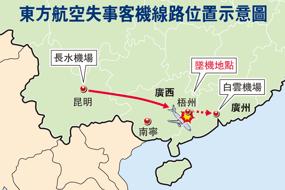 香港文匯報訊(記者 曾萍、夏微 廣西南寧、上海報道)航旅飛行軟件「飛常準」顯示,失事客機註冊號為B1791,機齡6.8年,事發前曾執飛了昆明長水機場與重慶江北機場之間的往返航程,並於中午11:23飛抵昆明機場。事發後,東航官方微博於21日17時30分許發布了飛機墜毀的消息,表示已啟動應急機制,派出9個專項工作小組趕赴現場,並已開通家屬應急援助專線。東航官方微博的頭像也變為黑白色。