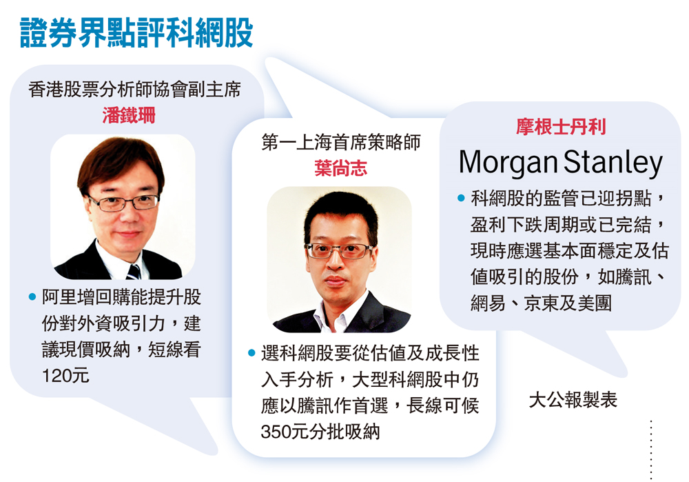 •科網股的監管已迎拐點,盈利下跌周期或已完結,現時應選基本面穩定及估值吸引的股份,如騰訊、網易、京東及美團