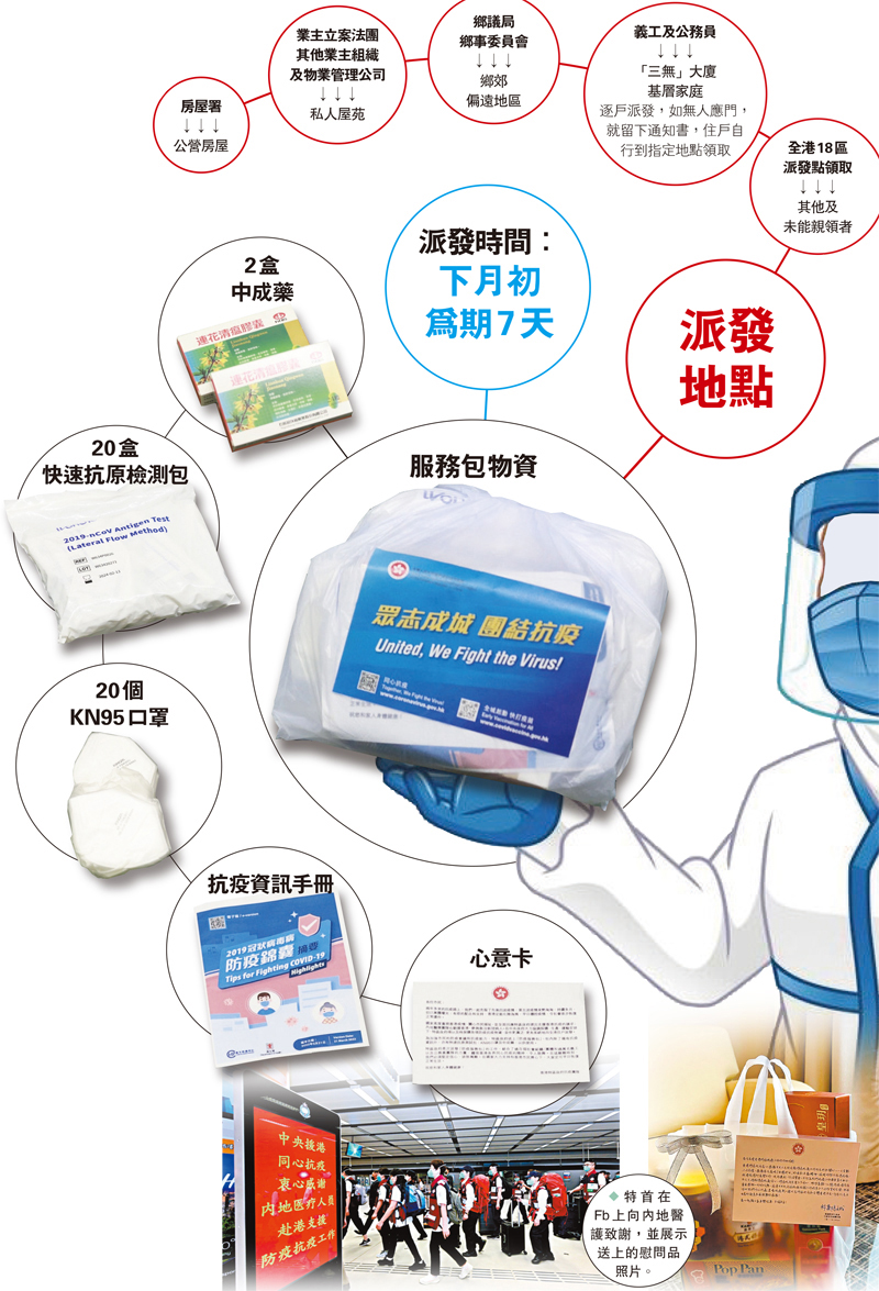 陳積志補充,防疫包內主要是中央援港的抗疫物資,包括有中成藥、抗疫用品包括快速測試、KN95口罩及抗疫資訊手冊和心意卡,稍後先進行包裝工序,下月初則在全港18區派發,目標7天內完成。