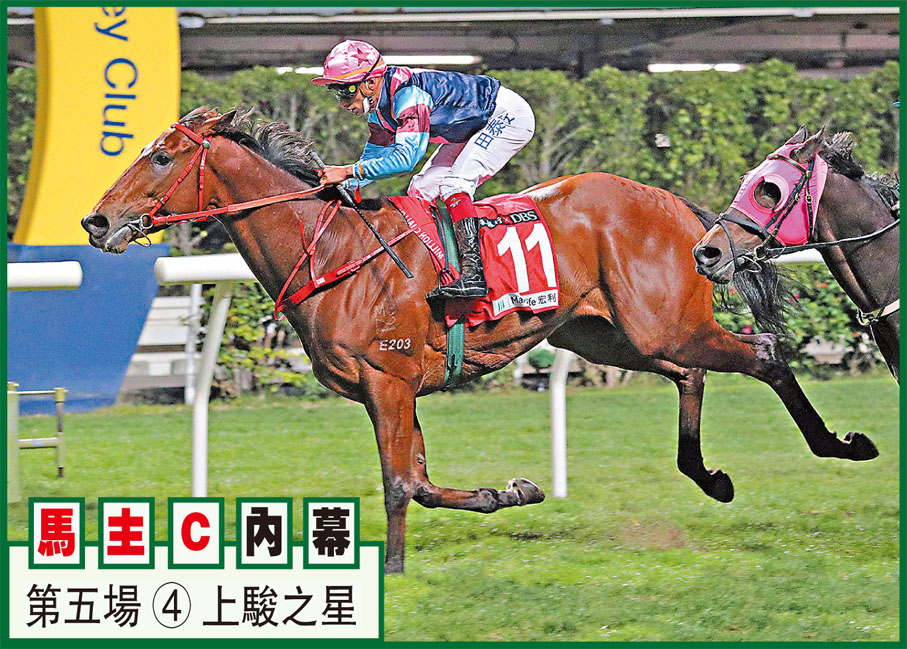 第五場、第一班、一二○○米。「上駿之星」季內跑過四次,前仗易配田泰安角逐泥地千二叩響今季勝門,剛役移師窄場千二,亦以輕鬆姿態打疊再贏,力拒「暖在你心」及「韋小寶」來犯;今次回師泥地千二只孭輕磅,排有利三檔只要快閘楔得好位,有望締造三連霸佳績。