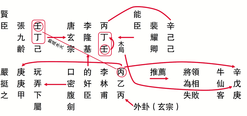(一)李林甫(丙乙丙)之所以能弄權,乃因李隆基的李姓丙進入了李林甫的外卦,表示雖然面對九五之尊的唐玄宗,在李林甫的心中也不過是與自己一樣重要的外人,乙木生丙,所以只需要阿諛奉承,就會與「隆基」二字的丁壬成木局,表示唐玄宗是受落的。