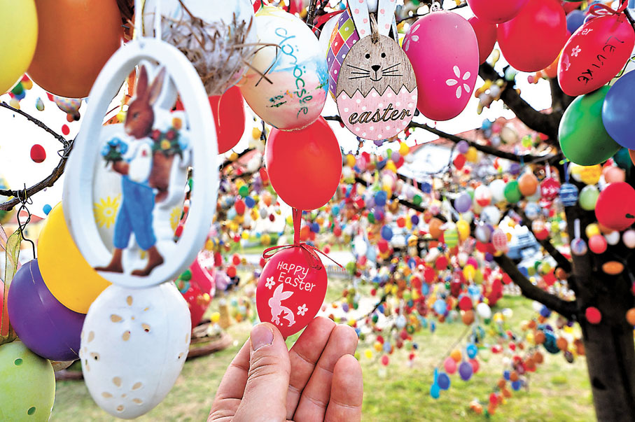明天就是復活節,在匈牙利亦有四天連假,星期五是紀念耶穌受難的Good Friday,虔誠的民眾會上教堂參加守夜彌撒,接着是周末,最後是耶穌升天的復活節星期一,大部分人會利用假期拜訪親友,家人一起迎接春天並到郊外「走春」,享受陽光。而匈牙利紹莫吉州所轄的一個村莊凱特海伊,復活節裝飾處處,象徵復活節的兔仔及彩蛋以不同形態出現,當街樹上掛滿了復活蛋,猶如滿樹花似的,極具氣氛。 ◆文、圖︰新華社