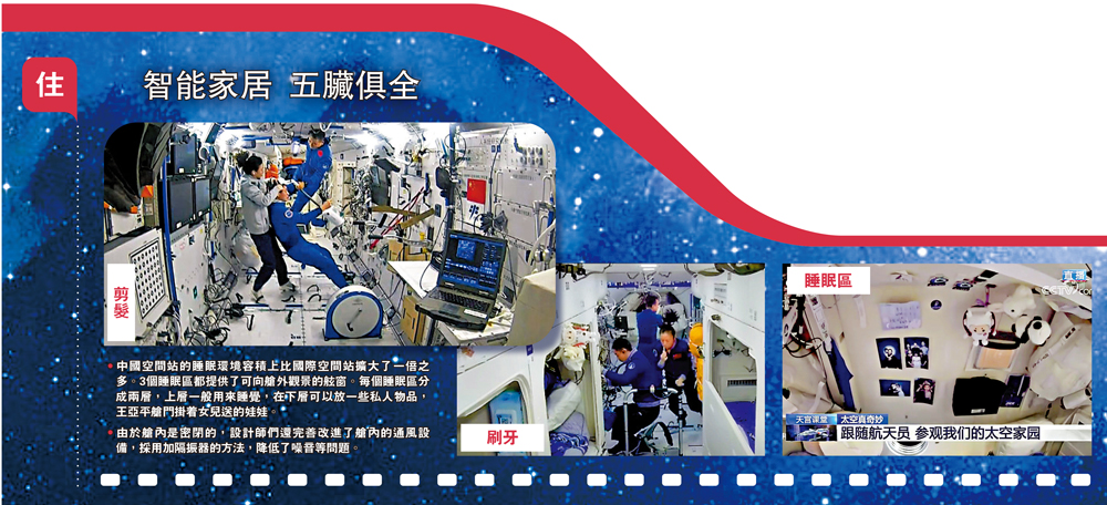 •中國空間站的睡眠環境容積上比國際空間站擴大了一倍之多。3個睡眠區都提供了可向艙外觀景的舷窗。每個睡眠區分成兩層,上層一般用來睡覺,在下層可以放一些私人物品,王亞平艙門掛着女兒送的娃娃。