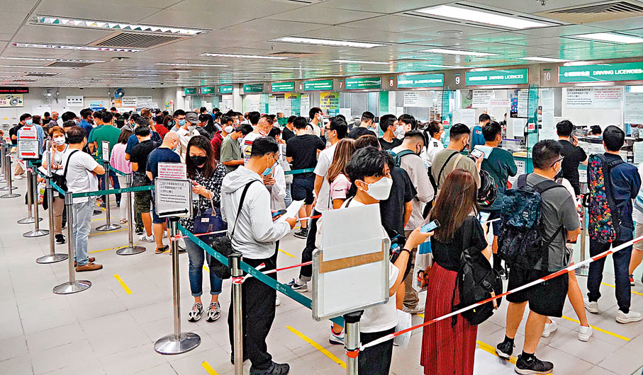 疫情下,運輸署的4間牌照事務處處理即時申請的櫃枱服務一度暫停,上周四才重開,即時大排長龍,其中位於長沙灣牌照事務處樓層的人龍「打蛇餅」,再於大堂繞多圈,輪候時間長達7小時,即使櫃台服務已重開一周,昨日仍要排隊數小時才能交辦手續。有巿民指,「排了幾小時,腳都軟,年紀大。應該電子派籌,早些來約時間,不用大家一起在等。」審計署去年曾實地視察,發現長沙灣牌照事務處相對其他3間排隊人龍較長,環境亦較擠迫;惟在較少人流的觀塘牌照事務處,輪候時間亦不短。運輸署雖曾試驗派籌安排,但解釋因牌照種類多,常見由代理人辦理多個申請,最後決定不設派籌。惟審計署認為,運輸署確實有需要探討在可行情況下,設立派籌制度,以改善輪候情況。