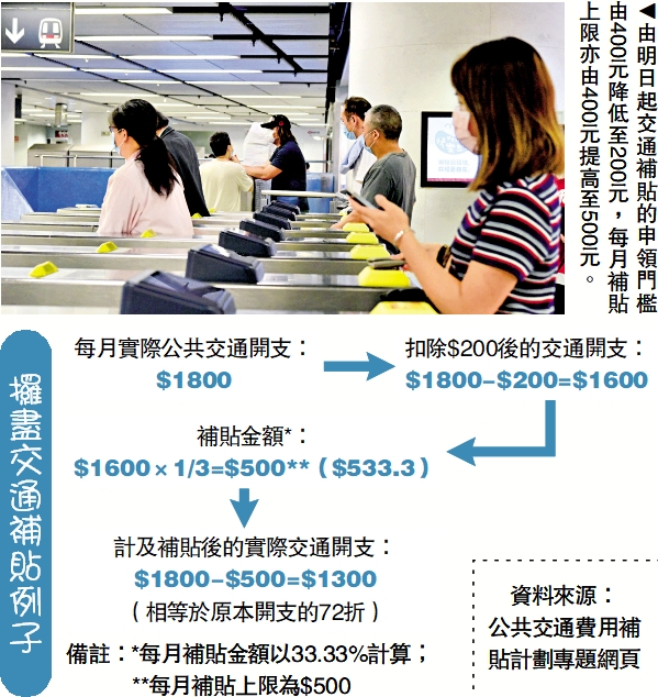 你今個月嘟咗未啊?相信大部分市民同譚鳴一樣,每個月都會去交通補貼領取站或者便利店,拍八達通領取交通補貼。由明日起,即是5月1日至10月31日期間,交通補貼的申領門檻由400元降低至200元,而每月補貼上限由400元提高至500元,市民每月超出200元的實際公共交通開支,就會獲得三分之一的回水補貼。換言之,搭得多回得多,搭得少都有得回水。