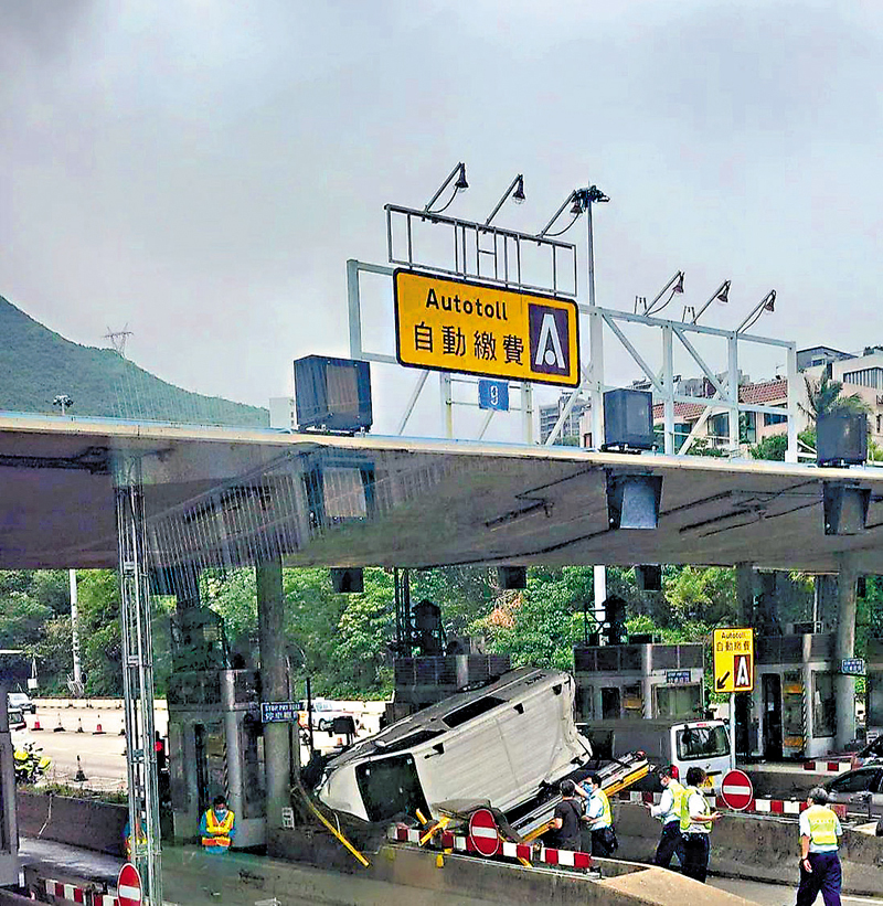 香港仔隧道收費亭昨午近3時發生驚險車禍。一名姓吳(51歲)男司機駕駛一輛客貨車由香港仔往灣仔方向,途至隧道收費亭時,他聲稱看見車上有蜘蛛後受驚嚇,結果車輛失控疑剷上收費亭分隔石壆後翻側,打橫掃向兩個收費亭,車身擱在自動收費行車道中間,車尾凹陷,收費亭玻璃窗、鐵欄嚴重損毀,幸未有殃及隧道職員,司機未有受傷,自行爬出車廂,無須送院,隧道公司出動吊車,將肇事客貨車吊起及由拖車拖走。 ◆香港文匯報記者 蕭景源