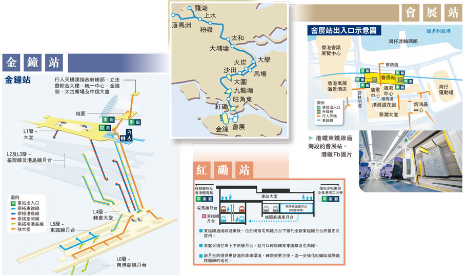 貫穿新界東北至港島的東鐵線過海段將於本月15日通車,成為香港第四條過海鐵路,而位於灣仔北的新建會展站,以及紅磡站和金鐘站的擴建部分亦同時投入服務。過海段通車後,市民無需轉車便可直接往來新界東北與港島,除了可令東鐵沿線居民一程過海,省卻每天往返市區需轉上轉的煩惱外,來往紅磡站至金鐘站的乘車時間亦由19分鐘大幅縮減至7分鐘。至於大眾關注的票價問題,港鐵公司行政總裁金澤培指出,過海段通車後,只新增了一個會展站,其他車站的車程組合票價未有轉變,但乘客過海就會再多一條線的選擇。港鐵又指,過海段通車後東鐵全線會完全使用9卡列車及新信號系統,可有更大彈性在繁忙時段加密班次,屆時繁忙時段將由每3分鐘一班車縮短至每2.7分鐘一班車,並足夠應付可能增加的載客量。港鐵將於下周一(9日)舉辦會展站開放日,讓市民率先體驗車站設施。 ◆香港文匯報記者 聶曉輝
