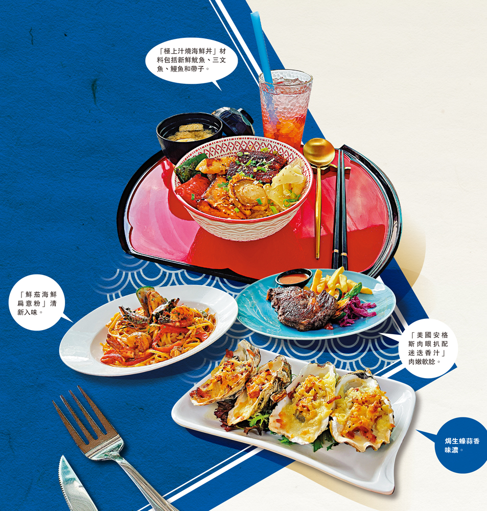 「Tablier Bistro & Bar」以意亞fusion菜搶灘,推出八安士「美國安格斯肉眼扒配迷迭香汁」「優質牛肉漢堡配芝士鵝肝番茄及薯條」「香煎鱸魚配意大利青瓜及燈籠椒」,以及佐酒抵食「香蒜焗生蠔」等美食,特設歐陸式露台雅座,讓大家可以慵懶半天享受日光。