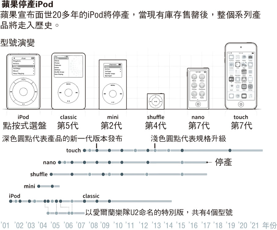 美國蘋果公司於2001年在萬眾期待下,首次推出音樂播放器iPod,成為顛覆音樂體驗的裝置,但在大量iPhone用戶使用蘋果串流音樂服務後,iPod發展走進死胡同。隨着蘋果前日宣布停產iPod Touch,iPod系列產品的21年歷史宣告落幕。