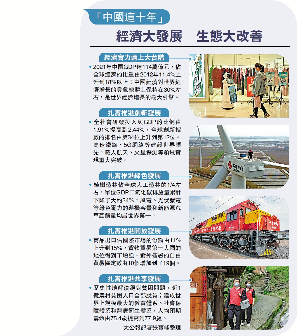 •歷史性地解決絕對貧困問題,近1億農村貧困人口全部脫貧;建成世界上規模最大的教育體系、社會保障體系和醫療衞生體系,人均預期壽命由75.4歲提高到77.9歲。