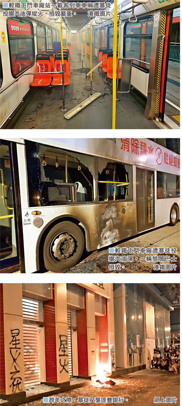 至昨日凌晨踏入2020年元旦後,黑衣魔的暴力升級,在多區向載有大批乘客的列車縱火。昨日凌晨2時許,一列開往屯門碼頭方向的615P線輕鐵,駛至屯門車廠站上落客期間,突有最少3名黑衣魔進入頭卡車廂內投擲汽油彈縱火。