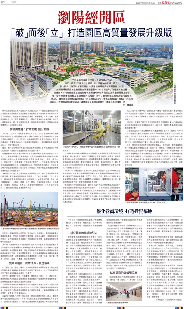 2019年新引進項目25個,合同引資426.85億元,投資100億元以上項目1個,投資50億元以上項目1個,投資10億元以上項目4個......國家級瀏陽經濟技術開發區(以下簡稱瀏陽經開區)主動對標高質量發展要求,以「兩個年」為總攬,�茪O轉型升級,努力推進產業基礎高級化和產業鏈現代化,園區的高質量發展再上新台階。全年預計實現規模工業總產值同比增長14.8%;實現規模工業增加值同比增長14.5%;實現固定資產投資228億元,同比增長23.3%;實現工業投資211億元,同比增長23%。在湖南省133家省級以上產業園區發展綜合評價中,連續三年獲得第一名。■文:傅春桂