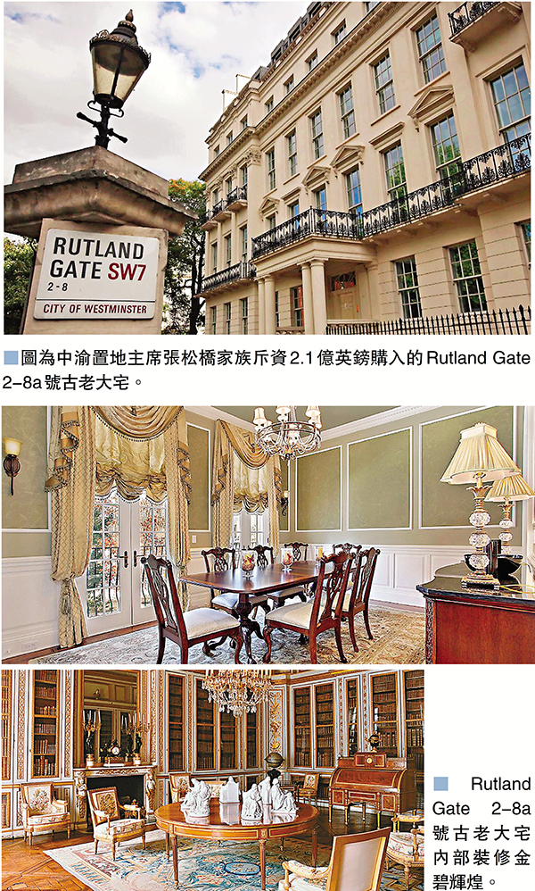 香港文匯報訊 (記者 梁悅琴) 富豪愛磚頭,加上英國脫歐在即,英鎊匯價持續下跌,吸引不少富豪到當地買物業。中渝置地 (1224) 主席張松橋家族斥資2.1億英鎊 (約21.3億港元) 購入英國倫敦武士橋(Knightsbridge)Rutland Gate 2-8a號一幢擁有45間房的古老大宅,有望打破倫敦單一獨立屋成交價新高紀錄。