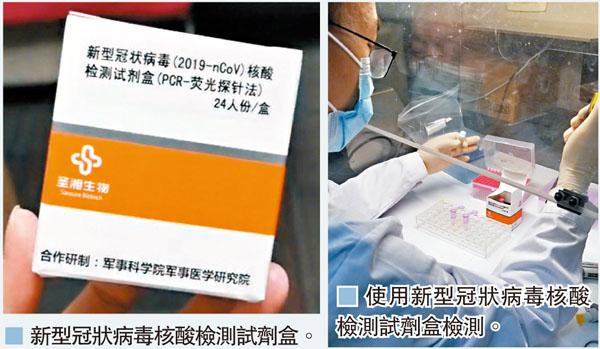 1月28日,由中國人民解放軍軍事科學院軍事醫學研究院與聖湘生物科技有限公司共同研製的新型冠狀病毒(2019-nCoV)核酸檢測試劑盒(RT-PCR熒光探針法)通過國家藥品監督管理局應急審批,獲得醫療器械註冊證書。