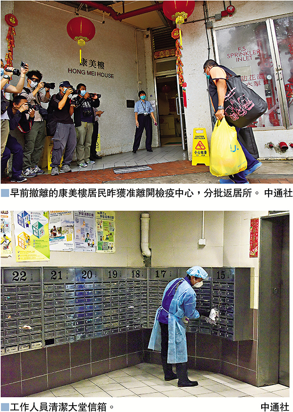 香港文匯報訊(記者 文森、杜思文)新冠肺炎疫情肆虐,青衣長康�h康美樓4名分別居於3樓及13樓的A07室住戶確診。由於擔心病毒經排污渠管系統傳播,衛生署上周二(11日)凌晨撤離大廈A07室逾百名住戶,並安排他們接受隔離。該批住戶隔離期間沒有出現病徵,並對病毒檢測呈陰性反應,獲安排於昨日陸續返回居所。有住戶形容隔離營內生活不錯,但「困住唔係幾好」,不打算繼續在家隔離。