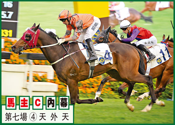 第七場、第三班、一六五○米。「天外天」(圖4號)上季來港時由方嘉柏訓練,出賽兩次後轉倉由大摩接手,情況比較罕見,而大摩不負所托,馬兒連贏兩場升上三班。今季此駒五戰皆由不同騎師策騎,首三次不是遇上不利形勢就是發揮有誤,到前仗田草一哩換郭能終於獲勝,勝後只加六分未算苛刻,值得注意的是此駒過往三次贏馬,除了開齋一役外,其餘兩次大摩同日均有馬配合出擊,可推斷主理人覺得牠一定有分在手,並視為變倍器,今次渡江搏殺對手爾爾,有力再食。