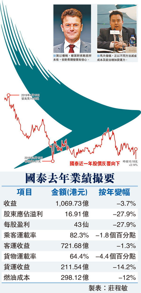 香港文匯報訊 (記者 莊程敏) 受到中美貿易戰致貨運減少、黑暴致遊客減少等打擊,國泰航空(0293)去年業績大倒退,賺16.91億元減少28%,其中下半年僅賺3.44億元,較上半年13.47億元大跌74.5%。舊患未消,今年新傷又至,集團料新冠肺炎疫情帶來重大負面影響,或需再大幅削減5月份可載客量及航班,料上半年將錄重大虧損。主席賀以禮昨指,公司有80%員工參與自願無薪假,雖暫無裁員計劃,但不排除當中可能性。