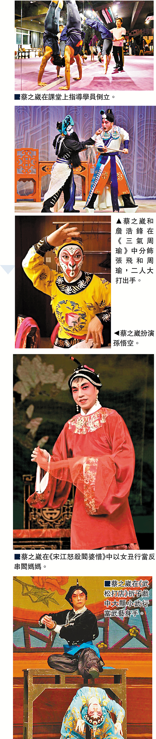 蔡之崴移民香港,在香港戲行多元化發展,與香港戲行感情深厚,在這疫情爆發的時期,他感受到粵劇界的冰河期,慶幸一群愛好戲曲體操的學員為健康、為練習目標,繼續要求上課,所以他以戲行武術為根基,為來健身練藝的人士設計一個叫《戲曲體操--氈子功針對課程》,和大家一起健體共度時艱。 ■文︰岑美華