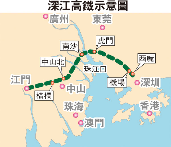廣鐵表示,深江高鐵作為內地「八縱八橫」高鐵主通道沿海通道的重要組成部分,將拉近大灣區與西部廣大片區的時空距離,提升深港、珠澳發展極對外輻射帶動能力。