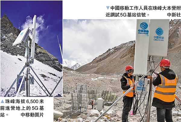 香港文匯報訊(記者 莊程敏)隨��5G應用的推廣,三大電信商也在不斷加快5G建設。中國移動(0941)日前公佈,在珠穆朗瑪峰海拔6,500米的前進營地開通5G基站,實現5G信號對珠峰北坡登山線路及峰頂的覆蓋,為全球海拔最高5G基站。其連同已投入使用的海拔5,800米的過渡營地和5,300米珠峰大本營等5個5G基站,為珠峰登山、科考、環保監測及高清直播等活動提供通信保障。在珠峰大本營現場實測,5G 100MHz獨立組網模式下行峰值突破1.6Gbps,上行速率高達215Mbps。