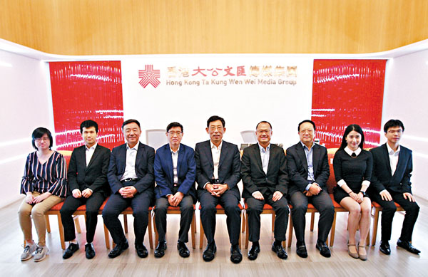 新華集團主席助理、內地事務總監、粵港澳大灣區企業家聯盟總幹事長張建華(左四),雲南省政協委員、新華傳媒集團董事、北京電影學院蔡冠深創新中心副總裁蔡頌思(右二),新華集團董事、華東區總裁蔡捷思(左二),蔡展思(右一),新華集團傳訊部總監韓馥檀(左一)一同到訪。集團副董事長兼總編輯李大宏(右三)、集團副董事長姜亞兵(左三)等陪同會見。