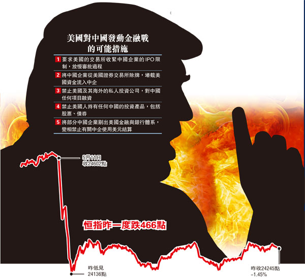 外電再傳美國擬禁止聯邦退休金投資中國股票,特朗普在白宮記者會上再度針對中國;此外,內地《環球時報》報道,就美方在疫情問題上持續針對中國,有內地貿易顧問建議應考慮終止中美首階段貿易協議,並重新商討新協議。市場擔心中美兩國關係再度緊張,加上內地PPI創逾四年最低,港股昨大跌356點,收報24,245點,成交971億元,藍籌股近全線下跌。■香港文匯報記者 周紹基