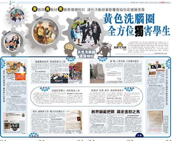 近年香港教育界遭政治入侵,大量「黃師」及毒教材肆意向年輕一代散播違法、暴力、仇恨及抹黑國家;而近日引起爭議的文憑試通識科及歷史科存在偏頗,甚至出現冷血試題,更進一步揭示教育體系疑遭不良意識滲透,莘莘學子慘受荼毒!香港文匯報記者進行深度歸納分析,拆解此環環相扣的教育問題:透過公開考試作為驅動力,並由「黃」教師、「黃」教材與「黃」教學方式全方位灌輸洗腦,再輔以課外活動「包抄」,以及利用年輕人朋輩間的巨大影響,加上「黃師」大本營教協為「黃師」專業失德惡行提供「保護傘」;攬炒派針對年輕學生的「黃色洗腦圈」已經成形。■香港文匯報記者 高鈺、姬文風