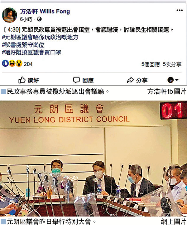 元朗區議會昨日舉行特別大會,防疫採購工作小組主席李頌慈動議將民政事務專員袁嘉諾驅逐離場,理由是民政專員「故意拖延」批核聖公會協助區議會防疫用品採購申請。