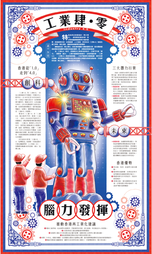 在「工業4.0」時代,即第四次工業革命的時代,工業不只靠「勞力」,更要靠「腦力」。工業升級應當持續進行,沒有終極目標,「工業5.0」、「工業6.0」將會持續來臨……只有不斷優化規劃藍圖,提升科研生態圈,吸引內地及國際大型企業在港設立研發及高端生產基地,才能更好落實「再工業化」,帶動經濟多元發展。
