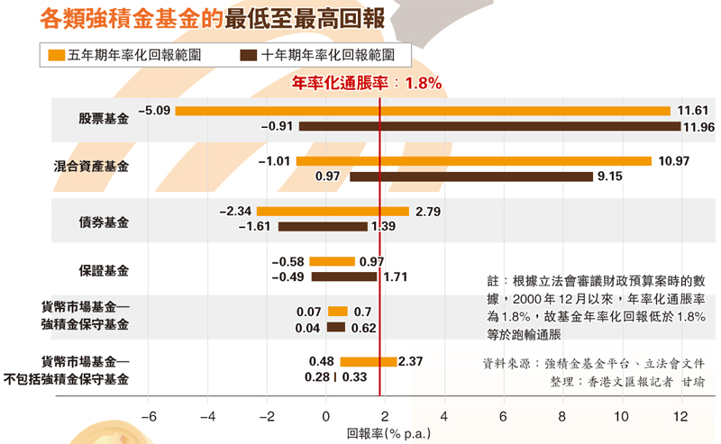 香港文匯報記者翻查自2000至2002年推出的成分基金多年來的表現,發現在195個基金等級中,年率化回報低於1.8%年率化通脹率的共有52個,佔整體基金數目近27%。與此同時,翻閱一眾基金在過去5至10年的年率化回報表現,發現若市民投資在保證基金、貨幣市場基金或保守基金,回報率通常跑輸1.8%的年率化通脹率。