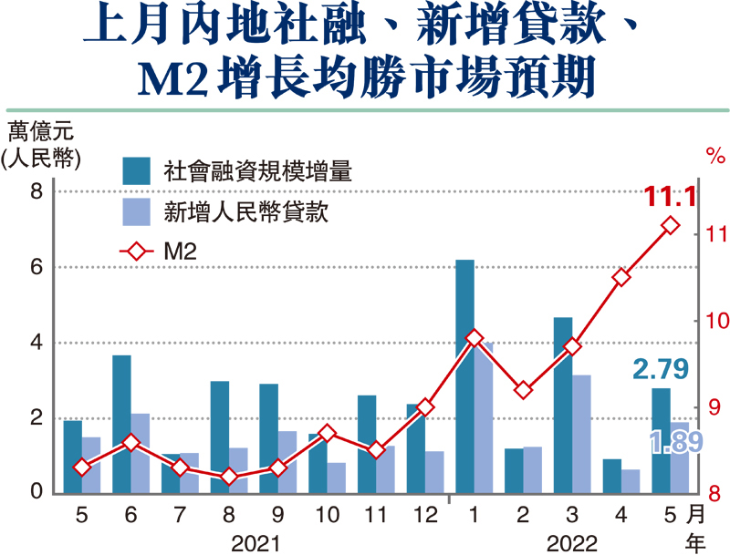內地部署穩住經濟一攬子政策措施,貨幣政策首先發力,5月新增信貸和社融規模均較4月低點多增近兩倍,大幅超過市場預期。中國央行昨日發布金融數據顯示,5月新增人民幣貸款1.89萬億元(人民幣,下同),同比多增3,920億元,新增社會融資規模2.79萬億元,同比多增8,399億元。5月末廣義貨幣(M2)同比增長11.1%,刷新2020年疫情以來高點。不過,信貸高增主要靠票據融資和短期貸款帶動,企業和居民中長期貸款增長疲弱,顯示實體經濟融資需求仍然乏力。