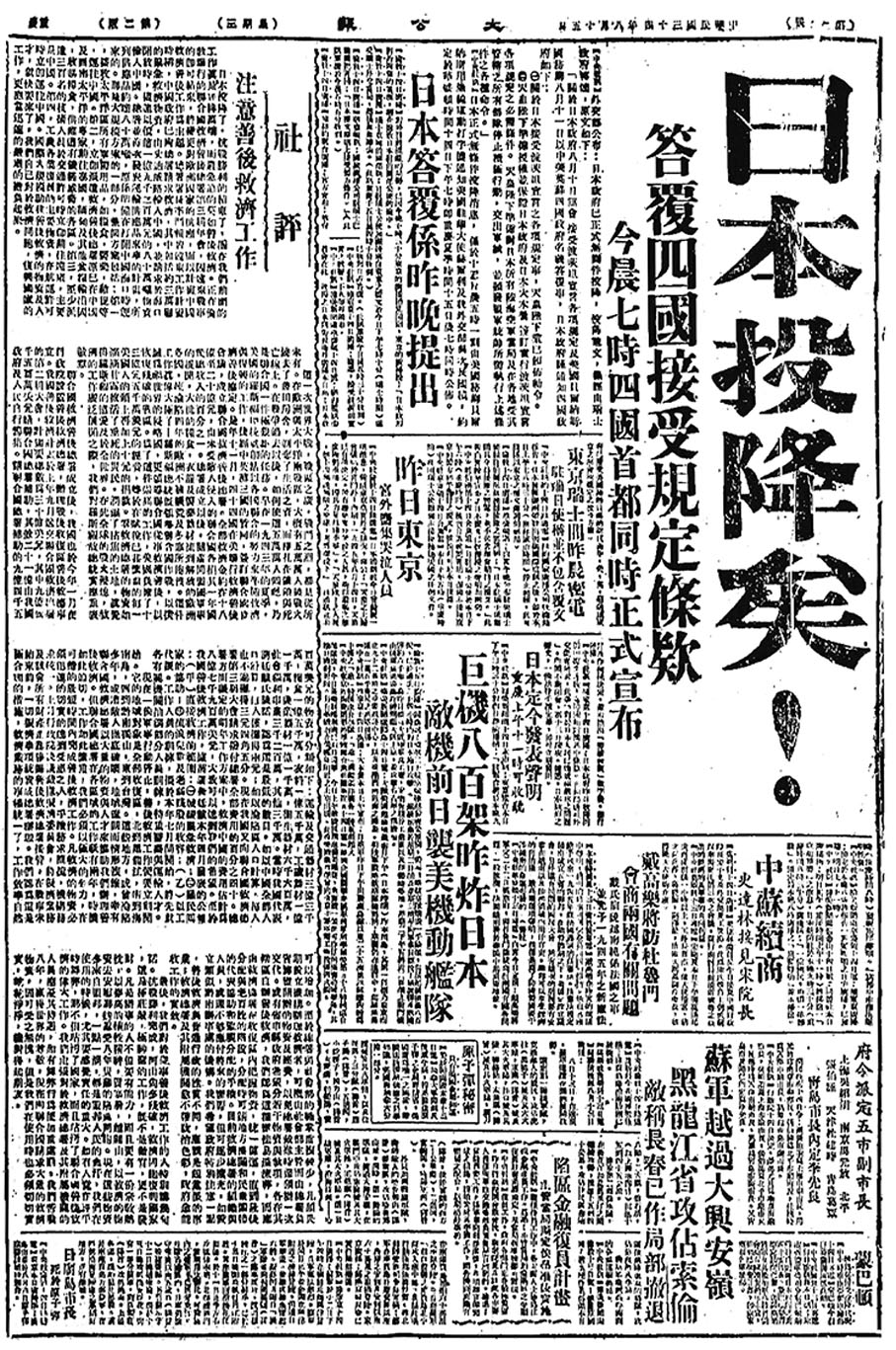 當日日本投降,《大公報》頭版頭條標題中出現了文言虛詞和標點符號,手法反常,卻簡潔醒目,意蘊無窮,堪稱經典。此版面現被國家列為一級文物。
