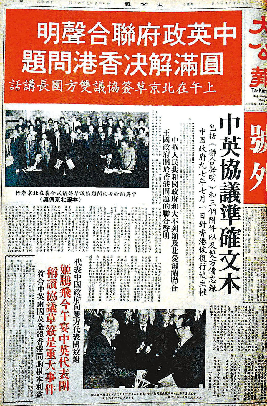 中英兩國政府經過兩年時間的外交談判,就香港前途問題簽署了《中英聯合聲明》,確認中華人民共和國於1997年7月1日恢復對香港行使主權。《大公報》記者現場採訪了《聲明》的草簽過程,並在港第一時間出版號外予以報道。