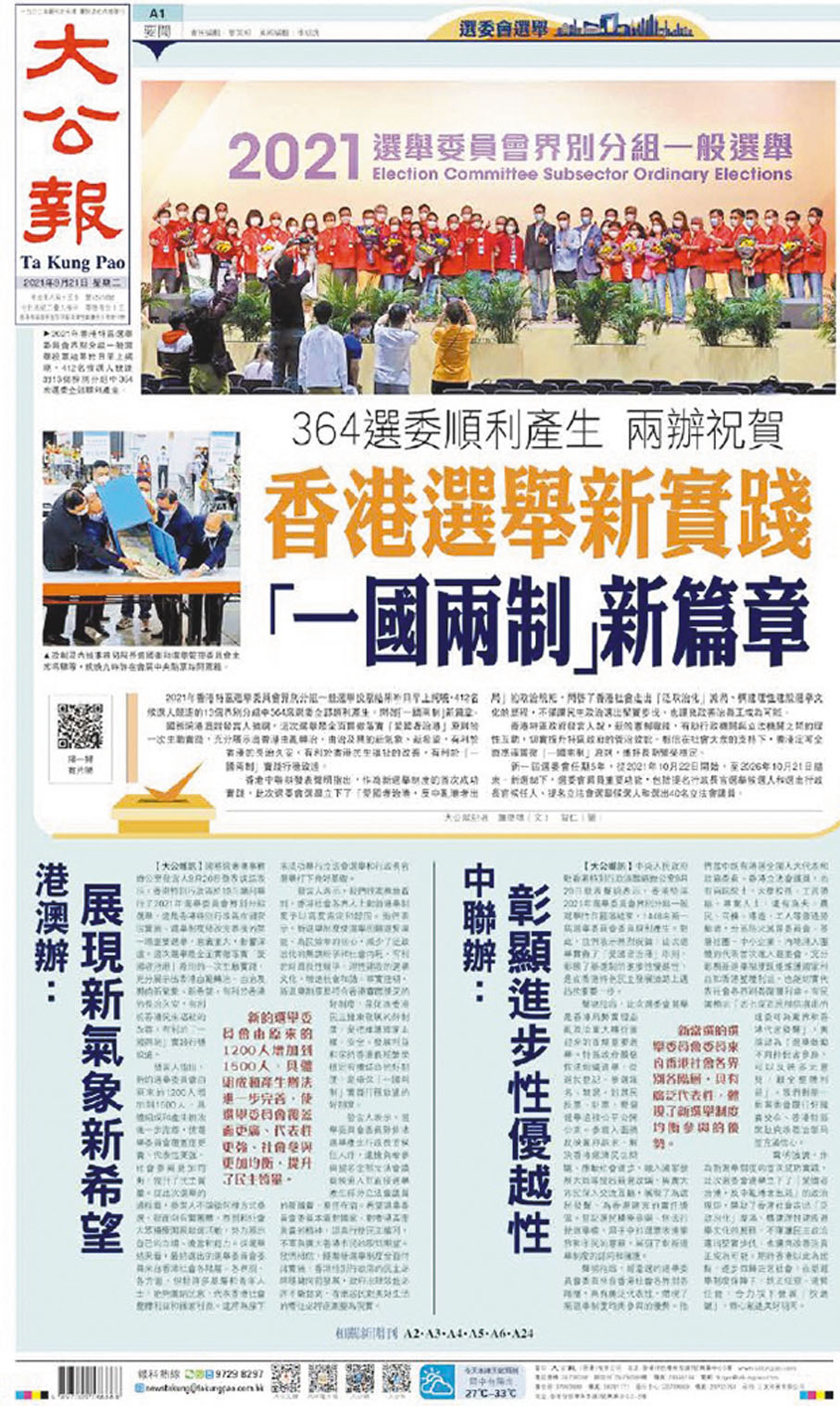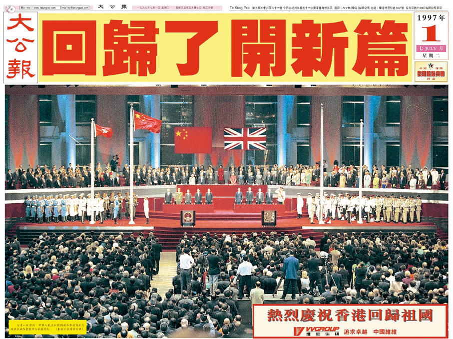 中國恢復對香港行使主權,香港從此結束一百多年的英國殖民管治,回歸祖國懷抱,成立香港特別行政區,實行「一國兩制」「港人治港」、高度自治。《大公報》當日的封面連同封底以別出心裁的設計,報道了這一劃時代的事件。