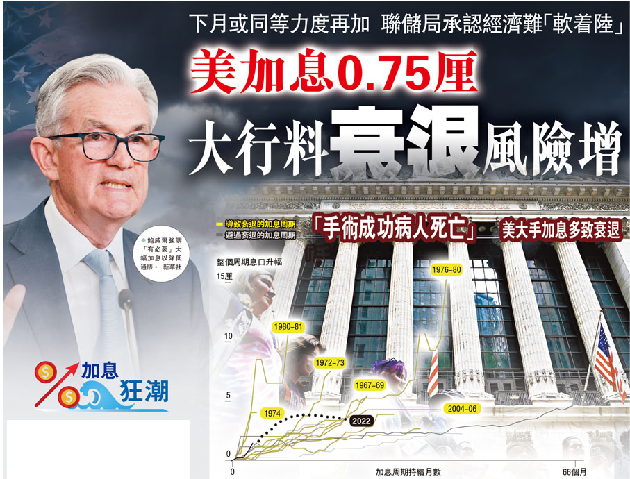 美國聯儲局前日一如市場所料宣布加息0.75厘,是近28年來最大幅度的一次。雖然美股在議息結果公布後大升,但市場關注聯儲局激進加息將加劇美國經濟衰退風險,聯儲局主席鮑威爾亦承認,想要在遏抑通脹的同時確保經濟「軟着陸」,已經愈來愈困難。
