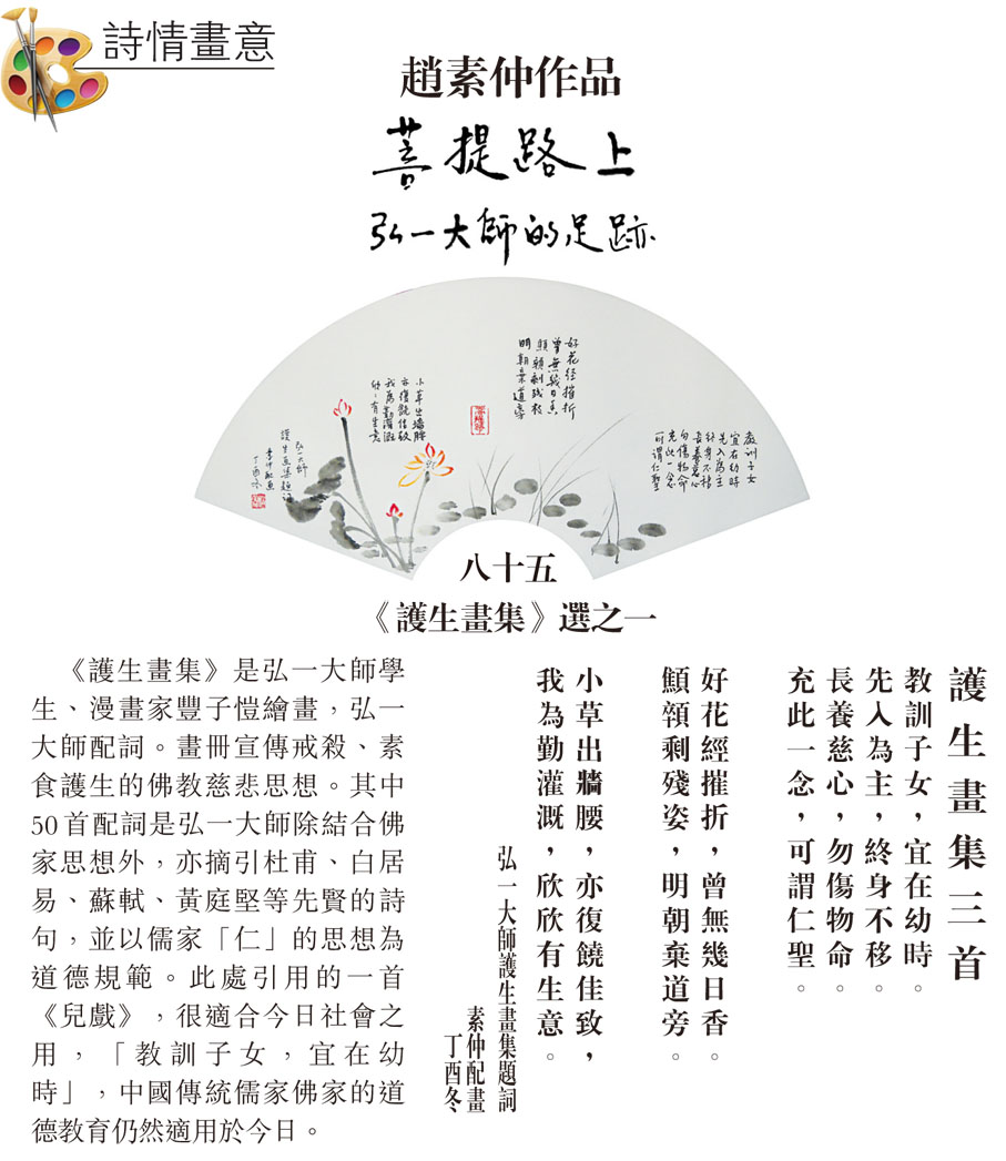 《護生畫集》是弘一大師學生、漫畫家豐子愷繪畫,弘一大師配詞。畫冊宣傳戒殺、素食護生的佛教慈悲思想。其中50首配詞是弘一大師除結合佛家思想外,亦摘引杜甫、白居易、蘇軾、黃庭堅等先賢的詩句,並以儒家「仁」的思想為道德規範。此處引用的一首《兒戲》,很適合今日社會之用,「教訓子女,宜在幼時」,中國傳統儒家佛家的道德教育仍然適用於今日。