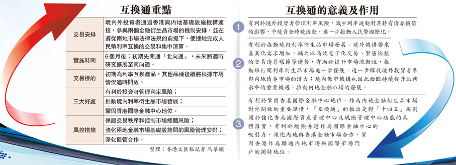 ③有利於鞏固香港國際金融中心地位。作為內地金融衍生品市場對外開放的重要舉措,「互換通」的推出是對「十四五」規劃關於強化香港國際資產管理中心及風險管理中心功能的具體落實,有利於增強香港作為國際金融中心的吸引力,深化內地與香港金融市場合作,鞏固香港作為聯通內地市場和國際市場門戶的獨特地位。