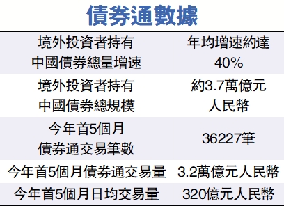人民銀行副行長潘功勝表示,債券通運行5年,境外投資者持有內地債券總量年均增速達40%,目前持債總規模更達到約3.7萬億元(人民幣,下同)。他又謂,香港作為國際金融中心,是內地金融市場開放的重要窗口和橋樑,也是國家對外開放戰略「先行先試」的重要試驗場。