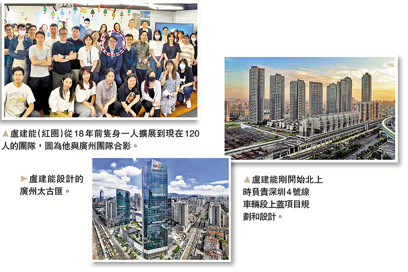 1997年香港回歸之際,從事建築規劃和設計的港青盧建能在LWK+PARTNERS(以下簡稱LWK)工作,2004年受公司委派,隻身北上深圳和廣州發展至今已有18個年頭,內地經濟快速崛起為他的事業發展帶來了無限機遇,他從當時一人北上到現在已是120人團隊、負責主管內地幾個分支公司的董事,他也將自己的聰明才智奉獻給內地。深圳地鐵4號線、廣州太古匯等大灣區許多工程均有他的貢獻。