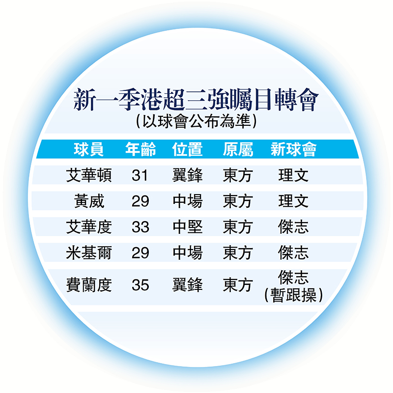 港甲聯賽盃曲終人散之後,也象徵着「2022至2023年度香港超級足球聯賽」踏入季前備戰階段。傑志及理文兩大爭標要角,昨日不約而同公布簽入多位東方龍獅主力球員。按目前形勢分析,東方龍獅流失大量好手之後,與傑志及理文實力漸拉開差距,港超爭標「三強鼎立」的局面勢成歷史。 ◆香港文匯報記者 黎永淦