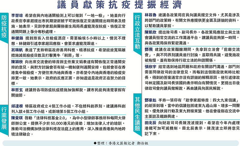 李家超昨日帶領3名司長及3名副司長,一同出席首場立法會「前廳交流會」。李家超在會後指出,大家在交流會上很積極,氣氛非常良好,在討論時亦很坦誠,亦提到了實際問題和一些想法,他對此非常滿意。他認為,第一次交流會有這個成績,令他更有信心將「前廳交流會」發揮得更完善和對大家更有作用,最終令整體市民受惠。