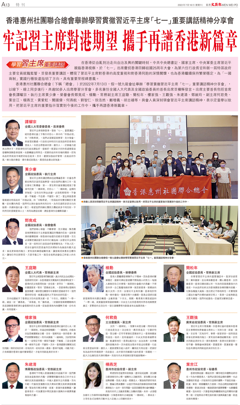 香港惠州社團聯合總會(下稱「總會」)於2022年7月13日,假一號九龍會址舉辦「學習貫徹習近平主席『七一』重要講話精神分享會」,以線下、線上同步進行,共逾50多人出席學習分享會,多名兼任全國人大代表及全國政協委員的首長出席並積極發言。出席主要首長包括首席會長譚耀宗,執行主席黃少康,榮譽會長鄧竟成、楊勳,常務副主席王庭聰、簡松年、樓家強、王觀強、朱建清、鄧婉玲,副主席何君堯、葉吉江、楊燕芝、黃紫虹、關國偉、何燕航、劉智仁、徐浩然、鄭增義、胡志禧等,與會人員深刻領會習近平主席講話精神,表示定當學以致用,把習近平主席的重要指示落實到今後的工作中,攜手再譜香港新篇章。